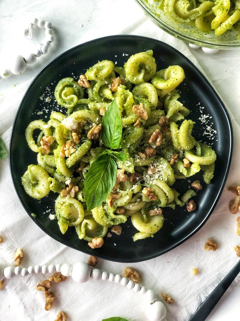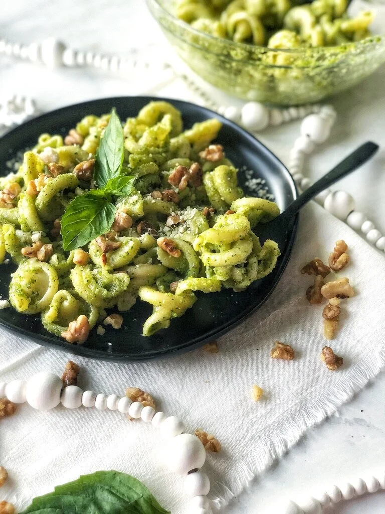 Traditional pesto, but made with walnuts instead of pine nuts!Pesto can technically be made with almost any type of nut like pine nuts, almonds, walnuts, etc. The most common and traditional pestos are made with pine nuts, which I love, but they are expensive and I pretty much only ever use them for pesto. I like using walnuts for this pesto because 1. I always have walnuts and 2. toasting the walnuts and adding them on top adds so much to this dish and compliments the pesto.Pesto is so simple to make and requires no cook time (not including the pasta). I think it's such a nice way to switch up pasta night instead of doing the same old red sauce or Alfredo. Pesto can also be made and kept in the fridge to be used on chicken, salmon or sandwiches.All you need to do is blend the ingredients in a food processor or blender and blend until smooth. I don't toss it with the pasta over heat because you don't need to cook the pesto. Instead I just toss it all together in a bowl while the pasta is still hot.